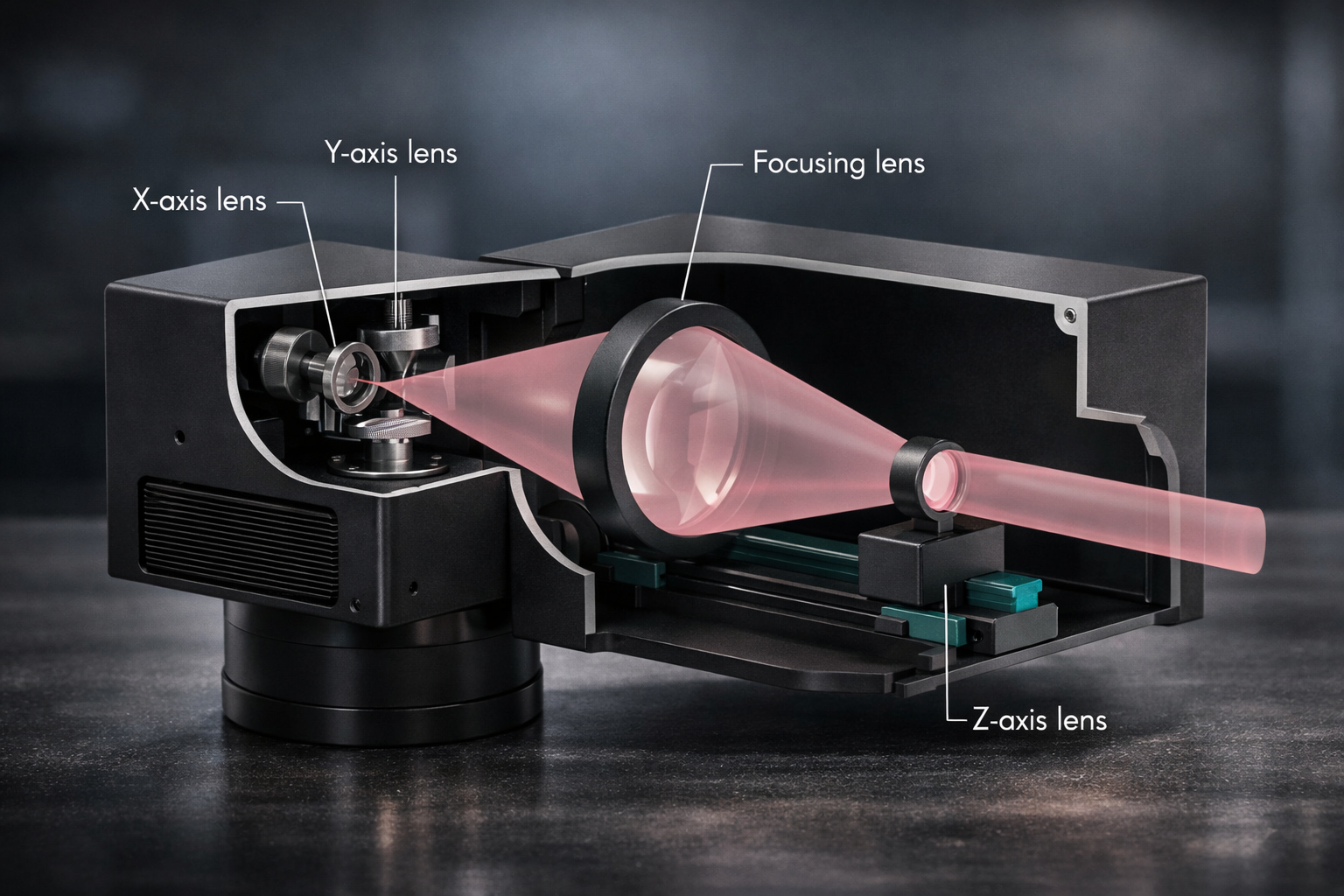 A 2D galvo laser system controls the beam across the X and Y axes, scanning over a flat work plane. Because the beam angle changes as the mirrors move, a special optical component called an F-theta lens is required to maintain consistent focus across the entire marking area.