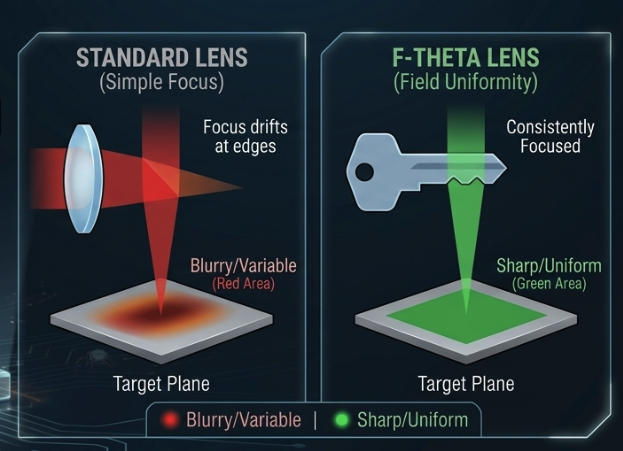 Without this lens, the beam would only be perfectly focused at the center of the field, while areas near the edges would drift out of focus. The F-theta lens corrects this geometric effect, ensuring the laser stays properly focused across the entire working field from edge to edge.