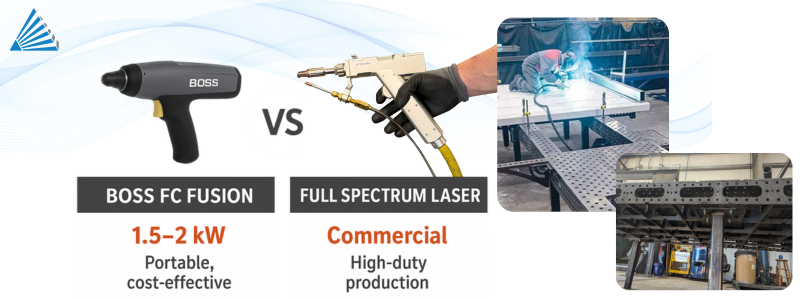 BOSS offers the FC Fusion, a handheld 1.5–2 kW system combining cutting, welding, and cleaning. It’s highly portable and cost-effective, but limited in power and throughput. Full Spectrum Laser’s solutions are designed for continuous, high-duty production—providing a higher return for shops scaling beyond hobby or light industrial use.