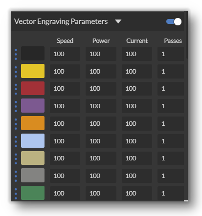 Vector current is a setting that is unique to vector files and is not present in the raster settings. The Vector current controls the spacing between pulses of the laser (AKA frequency). Setting the current to 100% will create constant power for smooth cutting, while lowering the setting will add increasingly more off time between the laser pulses. For example, if your laser is cutting through wood just fine, but leaves a lot of char on the edges of wood where it was cut, then try lowering the current for less charring and a more amber-colored edge.