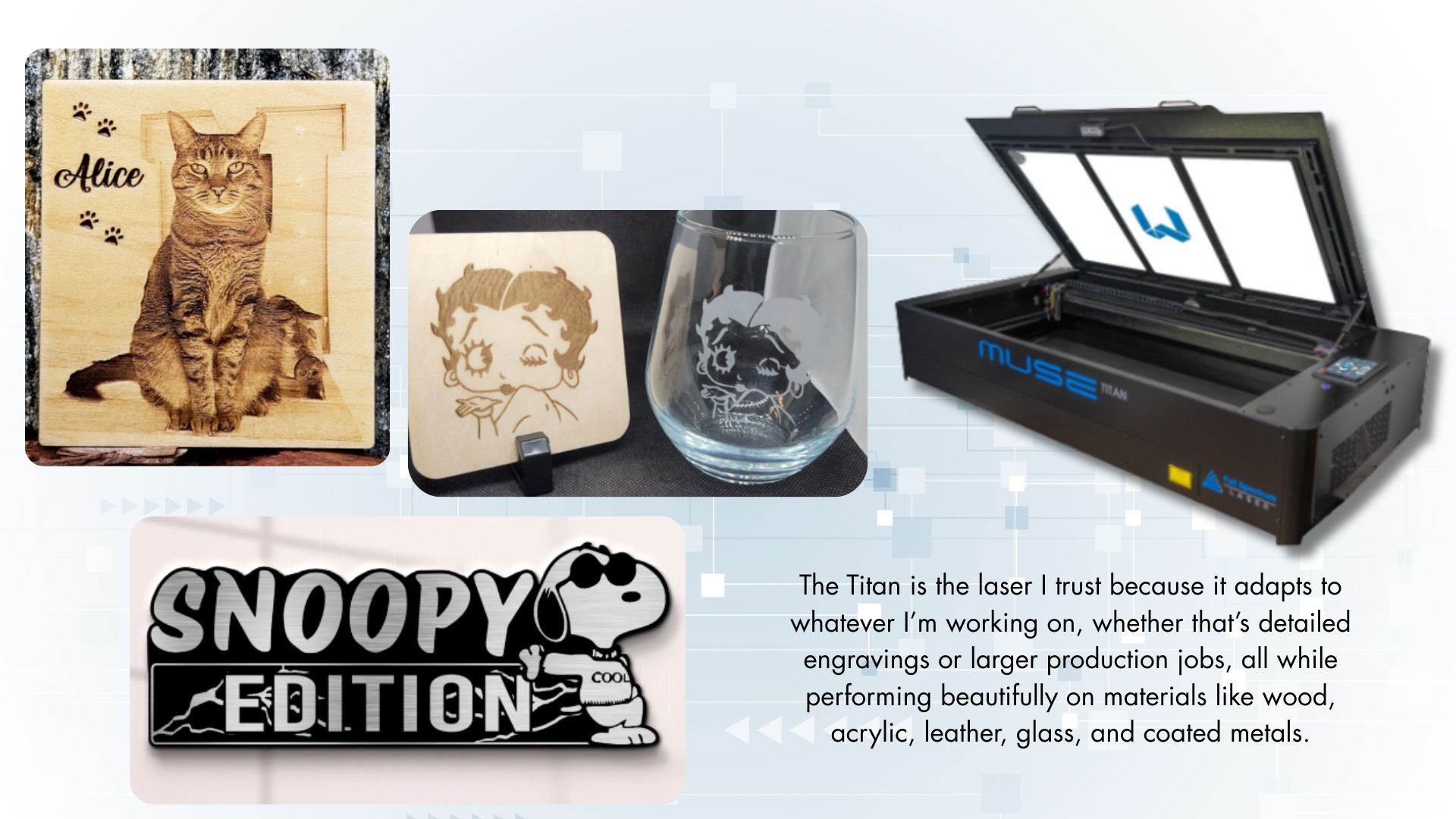 What I love most about the Titan is how adaptable it is. It handles large projects just as easily as small, detailed engravings, and the workflow feels intuitive whether you’re doing one-off custom pieces or full production runs. For me, it’s the laser I trust when I need consistent, high-quality results across a wide range of materials.
