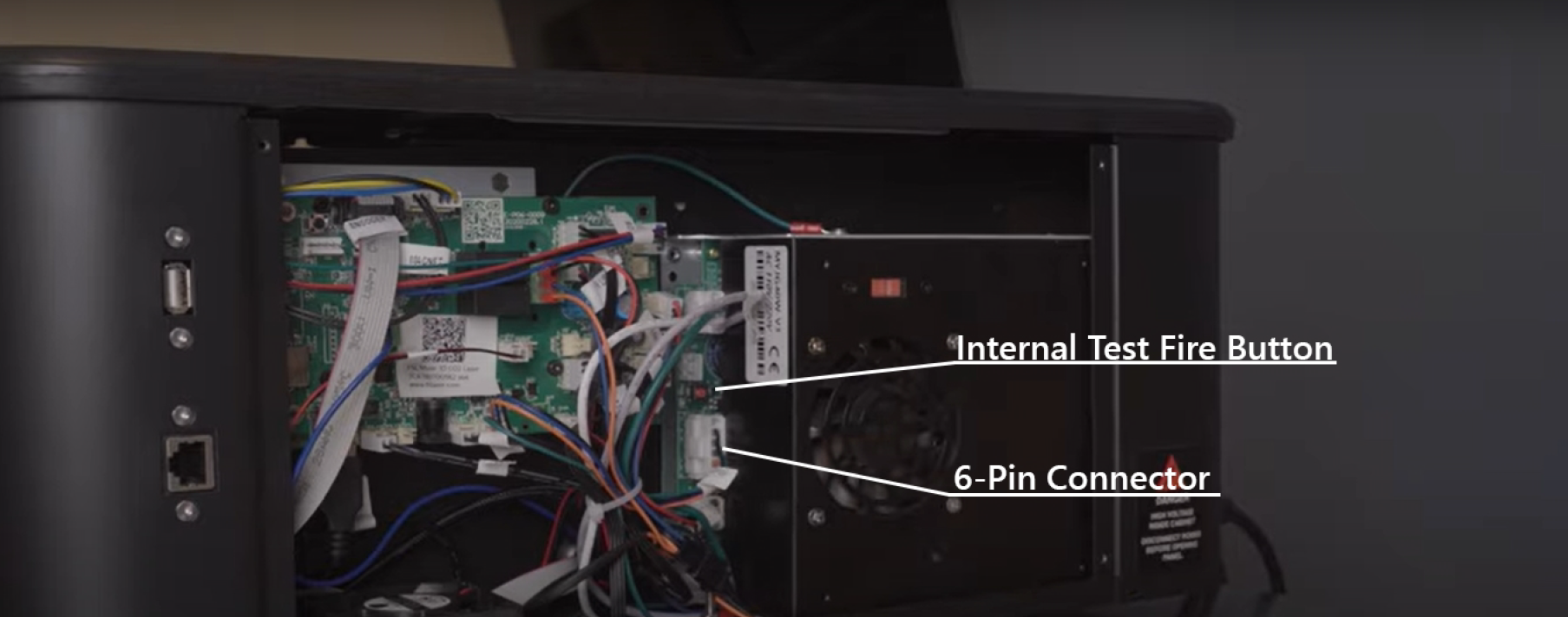 Remove the 6 pin connector by pulling it gently out of the slot; be careful not to bend the pins. By removing the 6 pin connector, all protections such as the lid and the water interlocks are overridden.