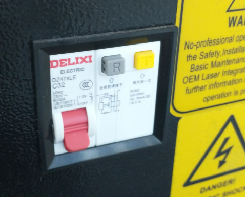 4. If the laser still does not power on after checking the ignition, E-Stop button, and fuse then proceed to take a look at the back of the machine where the breaker is located. Please ensure that the breaker is exactly in this position.